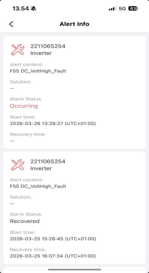 Trong trường hợp này, hệ thống lưu trữ quang điện dân dụng liên tục ngừng xuất trong thời gian có bức xạ cao vào ban ngày. Giám sát từ xa đưa ra cảnh báo. Ba trên - ảnh chụp màn hình trang web tạo thành một chuỗi bằng chứng hoàn chỉnh và hiển thị rõ ràng vấn đề cốt lõi: