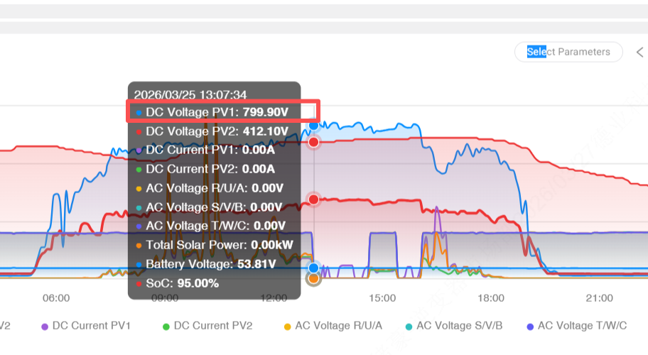 Ảnh chụp màn hình này là chìa khóa để root - nhận dạng nguyên nhân. Các điểm bất thường cốt lõi rất rõ ràng: Điện áp DC PV1 tăng vọt lên 799,90 V, dòng điện PV1 và PV2 là 0,00 A, SOC của pin là 95% với điện áp pin 53,81 V và điện áp phía AC đều là 0 V cho thấy biến tần đã ngắt kết nối với lưới điện.